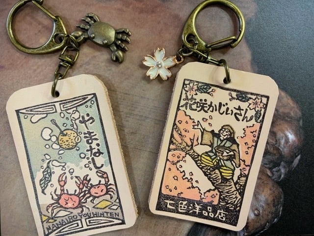 本革に消しゴムハンコを重ね押しして作られたキーホルダーです。