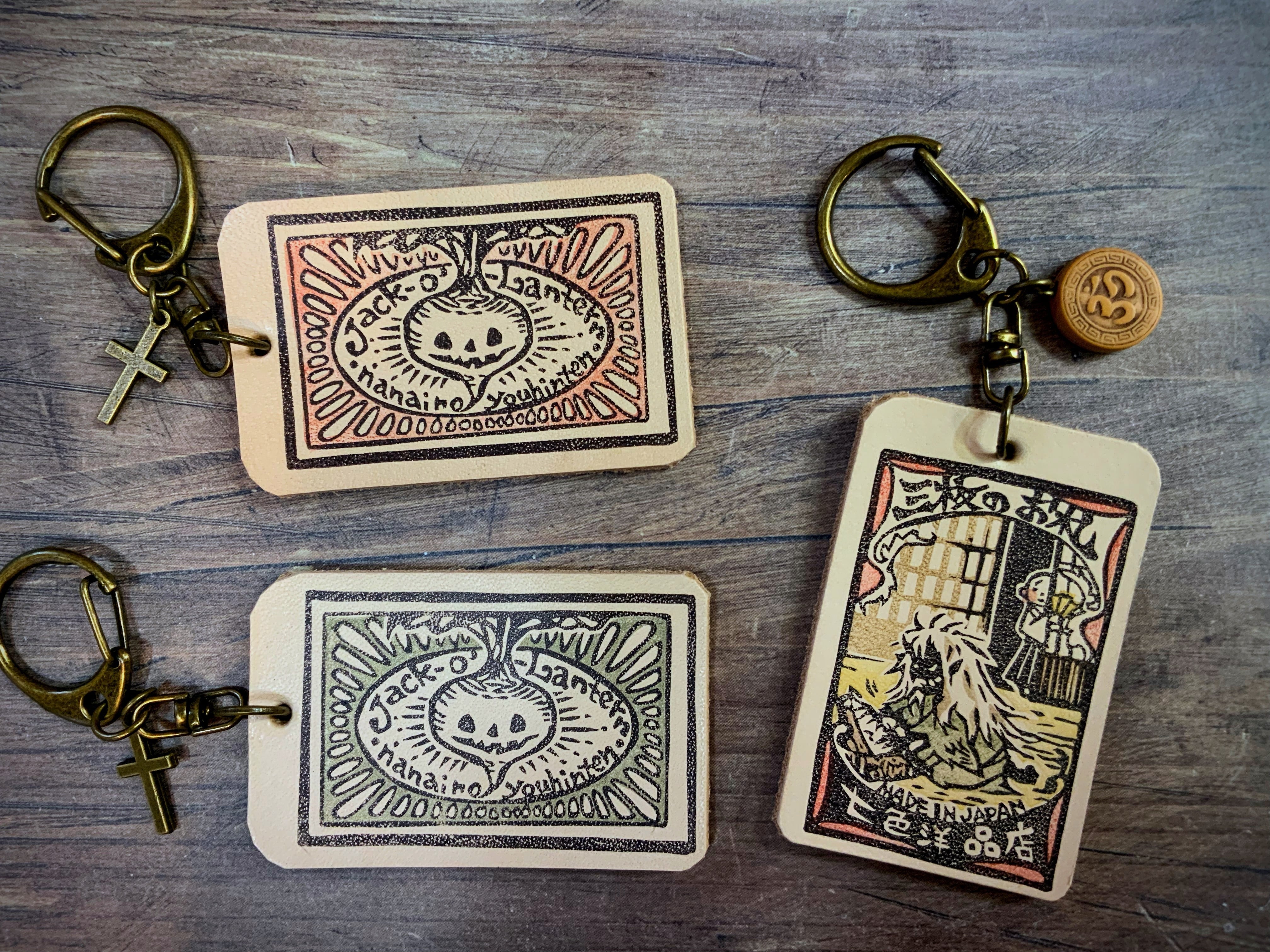 本革に消しゴムハンコを重ね押しして作られたキーホルダーです。